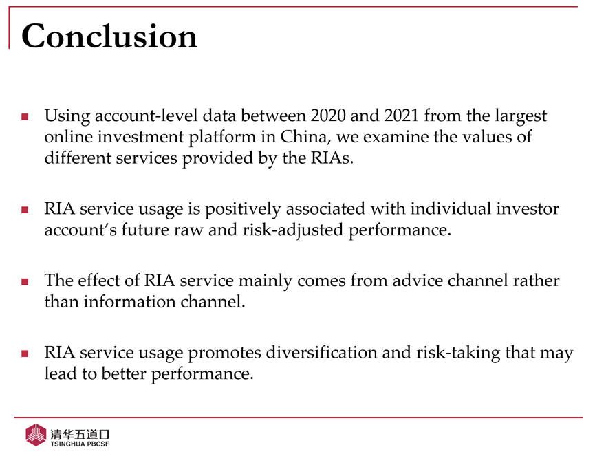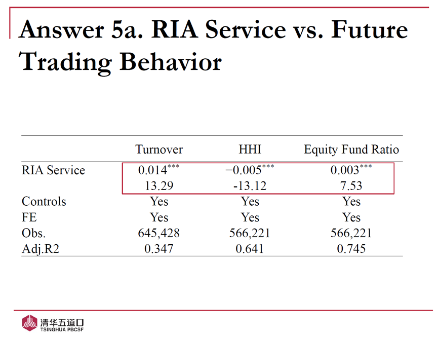 张晓燕教授团队主要讨论了三个方面的问题:(1)RIA是否有助于改善个人投资者的投资表现?(2)哪种RIA服务(信息服务或建议服务)对个人投资者业绩的贡献更大?(3)RIA是否会改变个人投资者未来的交易行为?