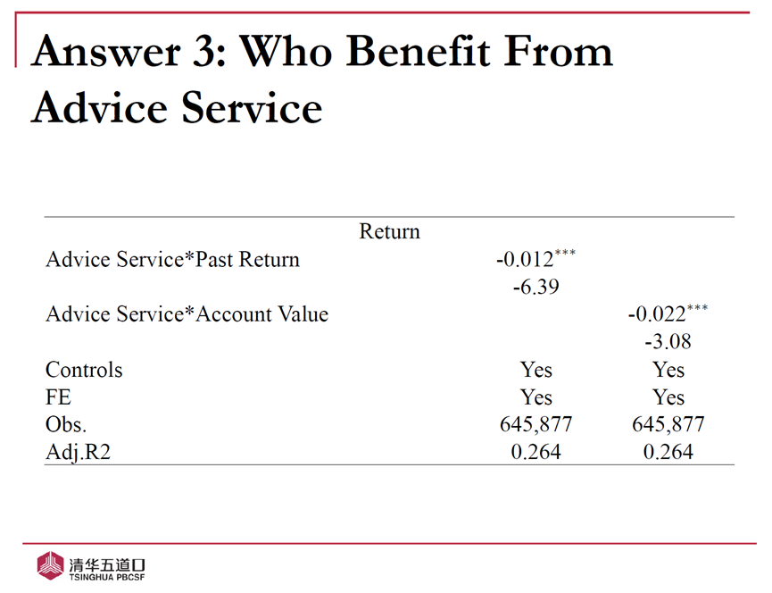 第三,文章讨论了哪类群体从建议服务中受益更多,发现过往收益率和账户价值较低的个人投资者更可能从建议服务中获益。原因在于,不同于成熟资深的投资者,经验不足的投资者缺乏信息处理能力,尤其需要建议服务的帮助。