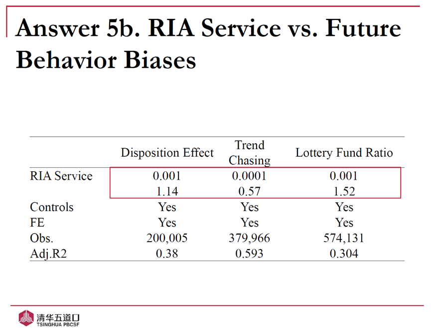 第五,在交易行为方面,虽然RIA服务的使用有助于提高个人投资者的换手率、多样化程度和风险承担能力,从而提高投资业绩,但并不会纠正常见的行为偏差,比如处置效应、趋势追踪和博彩偏好。