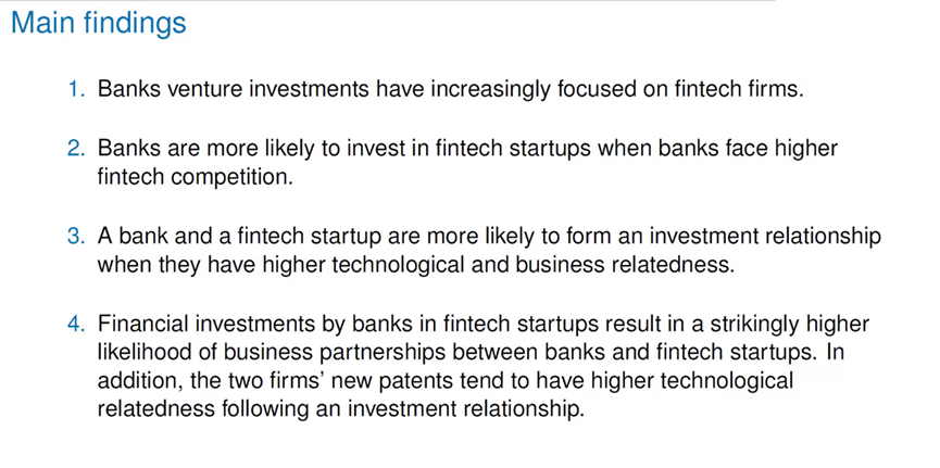 钱老师及合作者研究发现,有三类因素显著促进了银行对金融科技企业的投资:一是大科技信贷的竞争压力。以大科技信贷市场占有率在各州的增速衡量商业银行面临的竞争压力,研究发现这一压力显著促进提高了商业银行对金融科技企业投资的概率。二是技术关联度。以投资发生前商业银行和金融科技企业专利相互引用情况,或技术领域分布的相似度衡量两者的技术关联度,研究发现银行和金融科技企业的技术关联度越高,前者对后者投资的概率也就越大。三是业务关联度。银行和金融科技企业业务描述的文本相似度越高,前者越有可能对后者投资。
