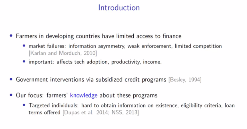Jacopo Ponticelli教授及研究团队运用印度的实证数据,深入探讨了缓解农民信贷项目中的信息摩擦对信贷获取的影响。为了准确量化农民潜在信息获取能力的变化,Jacopo教授借助了印度政府于2007年启动的共享移动基础设施计划(SMIS)所带来的移动电话覆盖变化。这一政策旨在资助在原先通信不畅的地区建设约7000个移动电话基站,从而显著提升了偏远地区的通信可及性。为了获取这一变化对农民信息获取能力的潜在影响,教授将新建基站所覆盖移动通信地理范围与农民拨打给Kisan呼叫中心(KCC)的电话数据进行了精确匹配,能够直观地展示通信设施的改善如何直接影响农民与信息服务间的互动频率,进而反映其信息获取能力的增强。