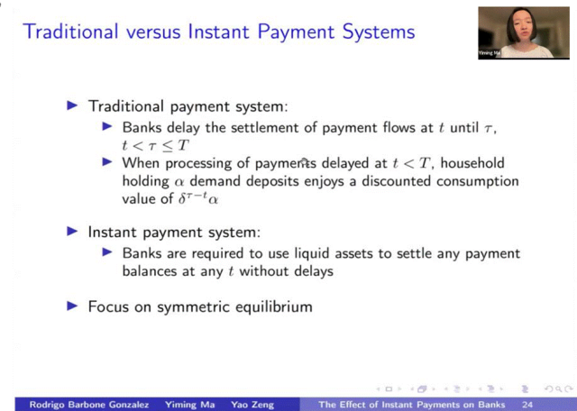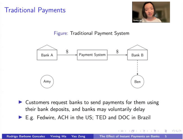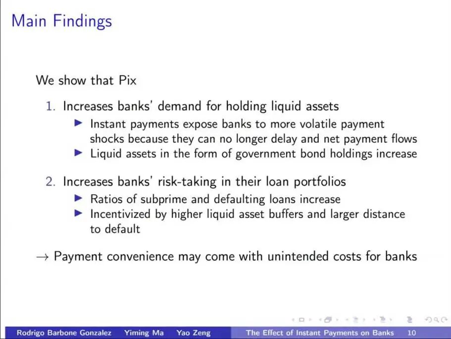 马一鸣教授和合作者们重点研究了即时支付系统对银行体系的影响。在传统支付手段下,银行则具有对支付时间更大的控制权。传统银行支付系统速度慢,银行过去倾向于将所有支付延迟到一天结束时进行净额结算。巴西的TED系统和美国的Fedwire类似,但仍可能延迟到当天结束。巴西的另一个支付系统DOC系统则更慢,会延迟到下一个工作日。这种延迟对银行影响很大,因为银行可以延迟付款以优化资金流动。