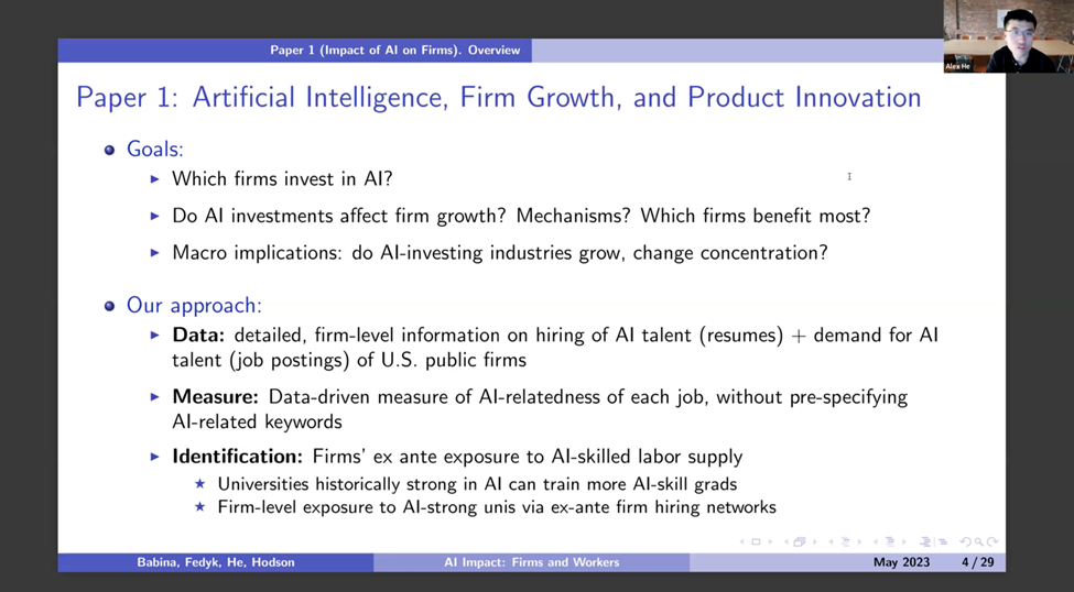 2023年5月18日,北京大学国家发展研究院、北京大学数字金融研究中心举办了春季学期的第十一次数字金融Workshop。本期Workshop有幸邀请到马里兰大学史密斯商学院金融学助理教授Alex Xi He(贺熹)做题为“The Impact of Artificial Intelligence on Firms and Workers(人工智能对企业和就业的影响)”的学术展示。贺熹教授分享了两篇最新研究《? Artificial Intelligence, Firm Growth, and Product Innovation(人工智能、企业成长和产品创新)》和《Firm Investments in Artificial Intelligence Technologies and Changes in Workforce Composition(企业人工智能技术投资与劳动力结构变化)》。本次Workshop由国发院助理教授、中心研究员胡佳胤主持,四十余位老师和同学通过Zoom参与会议并与主讲嘉宾进行了深入的交流和讨论。