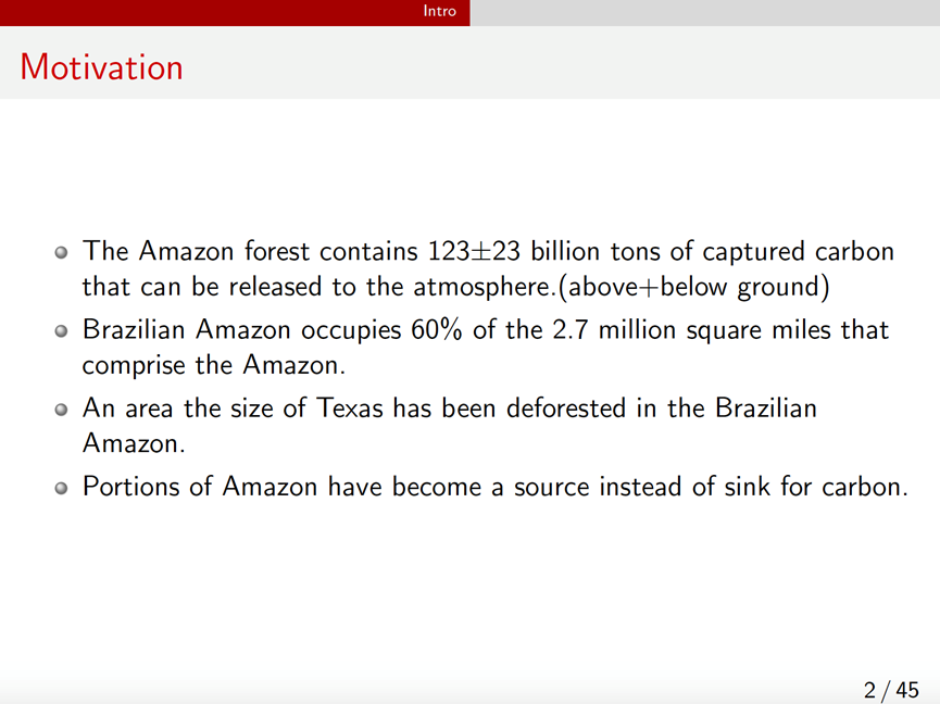 讲座伊始,Scheinkman教授对论文的动机进行了详细描述:亚马逊森林的碳储量为123±31PgC,如果这些碳释放到大气中,相当于美国的历史累计排放量。巴西的亚马逊占据了亚马逊270万平方英里的60%。从1985年到2021年,巴西亚马逊地区的农业面积从6.86万平方英里增加到24.05万平方英里。与之相关的毁林面积相当于德克萨斯州,进而导致了高排放量,使巴西亚马逊地区在各国人均排放量与人均GDP的比较在图中成为一个显著的异常值。(参见下图)