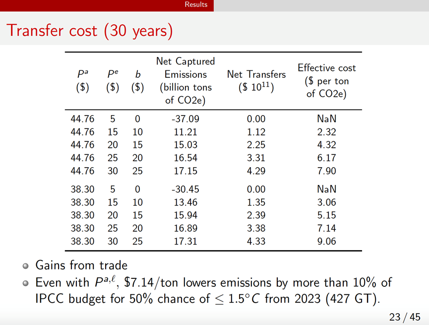 该研究对模型含义的分析分四个步骤进行。首先,使用该模型对1995-2008年期间毁林所揭示的碳排放影子价格进行了估计。1995年他们第一次获得可靠的牛价格数据。2008年,挪威和德国政府主导出资建立了亚马逊基金,该资金以5美元每吨的碳价格对减排行为进行补贴,在2008-2017年总共支付了12亿美元的补贴资金。这一基金项目为毁林行为如何受到外部支付的影响提供了一个案例。