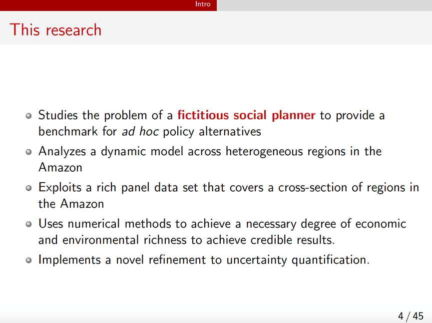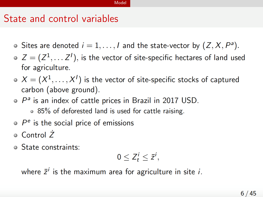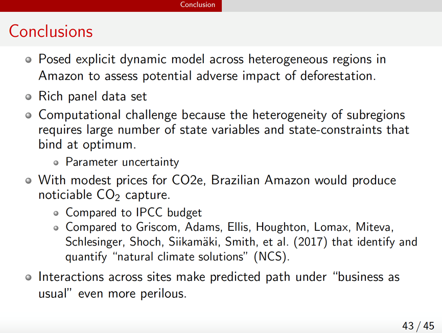 在该研究中,Scheinkman教授与合作者从一个空间动态的视角来建立模型,刻画农业生产与森林保护之间的权衡,并研究了制定政策减少毁林行为的潜在社会收益。该模型可以为决策者提供调整土地使用分配的经济激励机制建议。Scheinkman教授进一步通过多个数据集的详细空间信息来校准模型以便进行定量化分析。这些数据记录了巴西亚马逊地区养牛业生产率和潜在碳汇量的巨大横截面变异。为了解释这种可变性,他们将亚马逊地区划分为不同的子区域,这使得空间维度在分析中很重要。