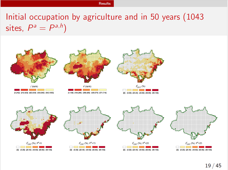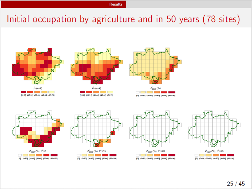 随后,该研究研究了亚马逊地区外部支付对净增碳汇量的影响。该研究在步骤2、3和4中产生三个聚合级别的结果。在第二步中,该研究通过构建1059个67.5km × 67.5km的网格来实现对亚马逊生物群落的覆盖。该部分研究得出的结果没有考虑农业产出价格的不确定性,假设价格为(a)价格序列中最高四分位数所对应的价格;(b)价格序列中最低四分位数所对应的价格;和(c)与拟合的双态马尔可夫过程的(静态)平均值所对应的价格。该研究利用这些确定性的解决方案来确定随机情况下的价值函数边界,并确定如果巴西签署了一项协议,在假定碳价下,是否会使巴西获益以及获益多少。该结果既显示了全面保护巴西雨林的社会收益,也显示了在横截面上重新分配生产的社会收益。
