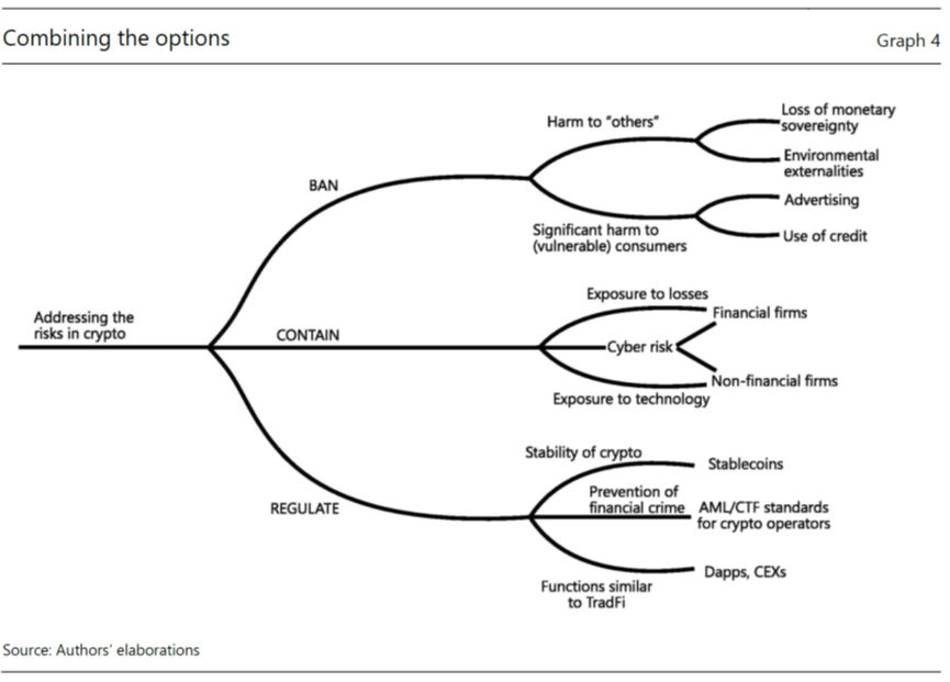 Frost与其合作者在文章中描述了2022年加密货币市场的失败和相应的脆弱性。在对2022年加密货币市场的崩溃进行总结后,Frost与其合作者提供了三种应对风险的建议:禁止(ban)、遏制(contain)和监管(regulate)。Frost与其合作者分别分析了三种政策建议的优缺点,并提供了如何组合使用这三种应对策略的分类法。