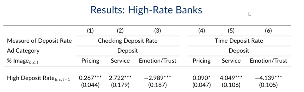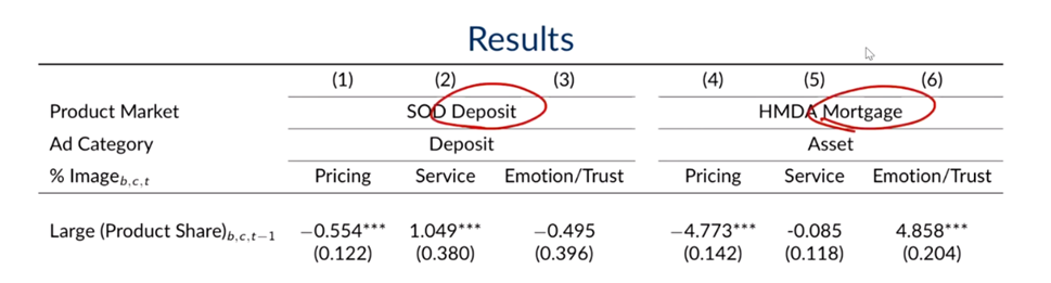 在完成对银行形象的分类后,马松教授及合作者构造回归模型以回答一开始提出的三个问题。研究发现如下:不同银行具有异质性,它们塑造了不同的品牌形象并制定了因地制宜的广告策略。当地市场份额较高的银行更注重服务和情感表达,而高存款利率的银行则侧重于价格优势,高服务质量的银行则更加突出服务本身;广告内容也会根据本地人口特征进行定制。