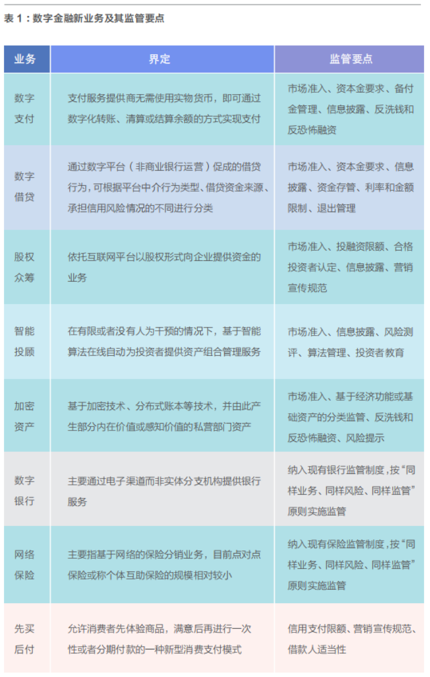 二是新业务模式。在数字技术支撑下,数字支付、数字借贷、股权众筹、智能投顾、数字银行、网络保险、先买后付等新型业务模式得到迅速发展。同时,支付、借贷、保险、资管等部分传统金融业务的流程和价值链实现“分段式”拆分,金融营销、反欺诈、风险管理、债务催收等节点由第三方服务商“嵌入式”提供服务或者以合作方式开展。从当前监管实践看,对数字金融新业务模式的监管规则体现了对传统金融监管的延续性和继承性,按照风险为本、穿透一致的原则,根据相关业务模式的风险特征和功能属性纳入现行金融监管体系,同时也体现了对数字经济时代要求的适应性和匹配性,针对新业务模式可能带来的新风险因素,对传统监管规则进行适应性调整。