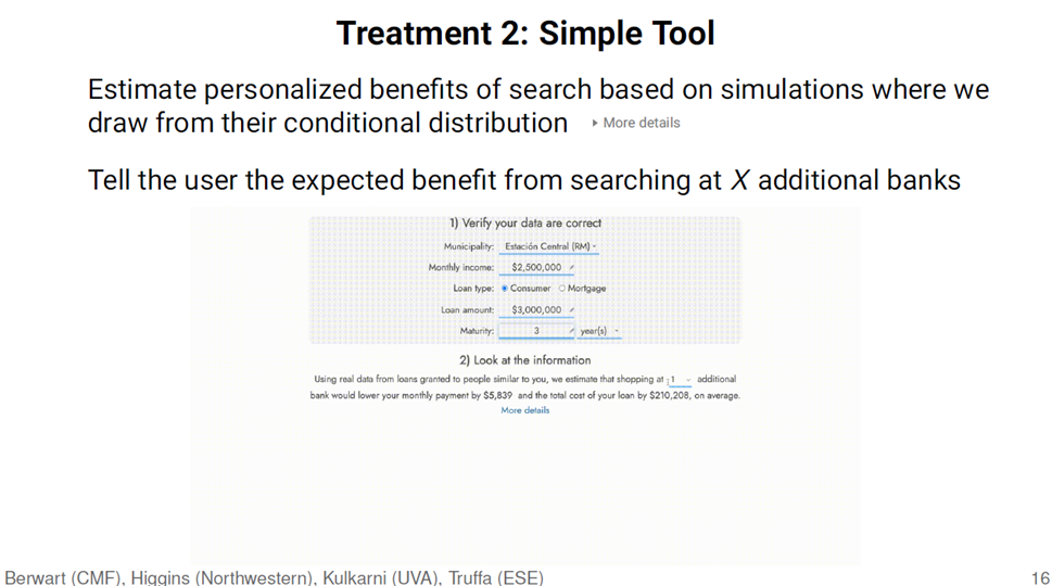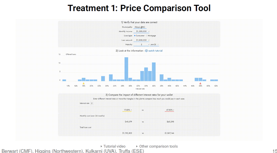 Higgins教授及合作者与智利金融监管机构合作,面向超过11万名寻求贷款的治理消费者开展了一项随机对照试验。首先,通过基线调查收集部分消费者对利率分布的初始信念。随后,将参与者随机分配为三组,分别提供完整的价格比较工具、简易的价格比较工具,或观看一段视频作为控制组。该工具基于智利金融监管机构提供的过去六个月行政数据,展示与用户相似借款人获得的利率条件分布。最后,通过行政数据和后续电话调查,研究者得以追踪参与者的搜索历史、谈判行为及最终贷款条款。