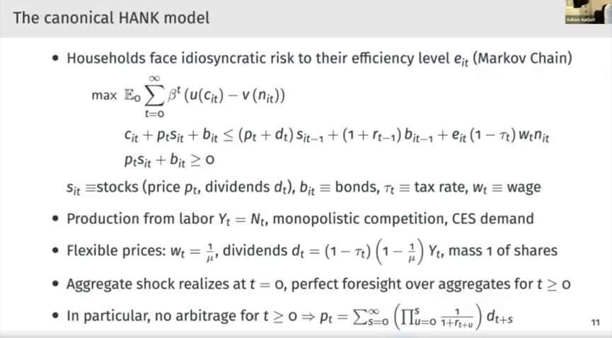 随后,Auclert教授分三部分进行了详尽的讲解。在第一部分中,他聚焦于“异质性代理人投资组合与风险溢价”的探讨。这一部分主要论述了在包含异质性代理人的环境中,一般静态投资组合的构建问题。通过对边际效用、预期收益、资产组合配置以及风险溢价之间的内在关系进行深入分析,Auclert教授推导出了基于二阶扰动的约束条件。这些成果不仅与静态不完全市场一般均衡理论中的研究相呼应,还与动态一般均衡(DSGE)模型中的二阶扰动理论紧密关联。本文献的核心贡献在于揭示了由任意数量代理人的最优行为所引发的约束条件,并将这一静态分析框架应用于异构代理模型,特别是在t=-1时的情境中,即假设所有冲击仅在t=0时发生,此模型为理解零阶投资组合提供了准确的经济学视角。