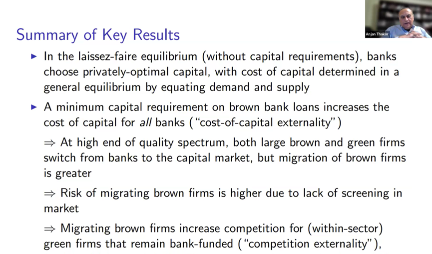 对此,Thakor教授及合作者构建了一个包含以下要素的两期模型:(1)棕色企业和绿色企业两类企业(2)银行融资、非银融资和资本市场融资三种方式;(3)监管政策:提高棕色贷款的最低资本要求。棕色企业污染造成社会损失,这是一个外部性,监管者会内化,但银行和企业不会。