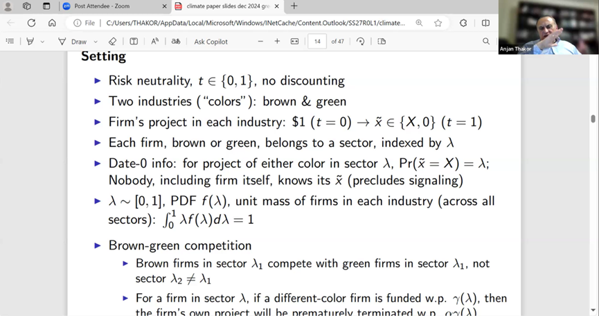 就企业方面,Thakor教授及合作者关注同一行业内棕色(传统)和绿色(环保)企业的竞争。例如,汽车行业中,通用汽车是棕色企业,特斯拉是绿色企业。两类企业具有不可区分的信用质量。如果竞争对手获得投资,会增加竞争压力,提高企业项目提前终止(净现值变负)的概率。企业可从银行或非银行机构融资。模型假设同一行业内棕色和绿色企业互相竞争,但不同行业之间没有竞争。如果两类企业中任意一方获得融资,则对手方的项目提前终止的概率会增加。每家公司在每个行业的项目需要在期初投资1美元,期末收益为随机变量,可能为失败或成功。其成功概率越高,则项目质量越高。期初,所有公司(包括观察者)都不知道具体的期末收益,只知道项目投资成功的概率密度函数。