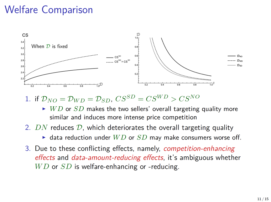 设定模型结构后,方教授与合作者讨论了三种情况:无监管、弱版本“数据中性”和强版本“数据中性”。其中,弱版本的“数据中性”要求平台向商家提供数量相同的数据,但价格可以不同,只要不超过非自营商家支付意愿的上限即可;而强版本的“数据中性”要求价格和数量都相同。在无监管情况下,可以证明,平台只向自营业务提供数据。在弱版本“数据中性”下,平台虽然名义上愿意为两类商家提供同样多的数据,但可以把面向非自营商家的价格提高到其愿意支付的上限。由于向两个商家同时出售数据会加剧下游的竞争并削减自营业务的利润,平台生产的数据量会较无监管时减少。在强版本的“数据中性”下,自营和非自营商家有可能同时以相同的价格获得等量的数据。不过,由于强版本“数据中性”之下数据的出售价格较弱版本时更低,平台生产的数据量会进一步减少。