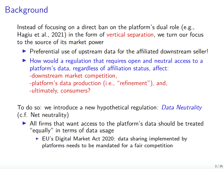 亚马逊、京东、淘宝等平台在数字经济的时代扮演着重要的角色。平台一方面方便了商家与顾客的交易,同时也收集着对商家有价值的数据。然而,当平台存在自营业务时,自营业务部门有可能获得平台的关照,获得比平台上其它商家更多的数据,从而在竞争中获得更大的优势。由此产生了一个监管问题:是否应当强制要求一视同仁地向自营和非自营商家提供数据?方汉明教授与合作者将这种假设性的监管政策称为“数据中性”(Data Neutrality)。