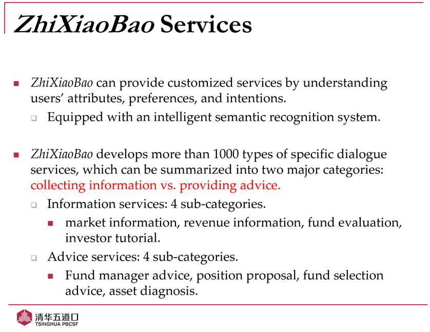 张晓燕教授团队创造性地将RIA服务分为两大类:收集信息和提供建议,前者包含每日行情、基金评测、收益分析、投资教程,供投资者决策时参考;后者包含基金选择、加减仓分析、资产诊断、基金经理推荐,供投资者直接采纳遵循。