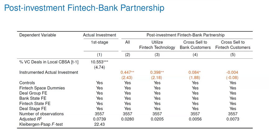钱老师及合作者进一步讨论了银行投资金融科技企业投资对于未来两者业务合作的影响。研究团队阅读了所有相关报道,并将业务合作分为三类:银行使用金融科技企业的新技术、金融科技企业向银行引流客户,以及银行向金融科技企业引流客户。为缓解内生性问题,研究使用了前一年金融科技企业所在地所有风险投资人中银行的比例作为工具变量。估计结果显示,银行对金融科技企业的投资确实促进了日后两者的业务合作,其中银行利用新技术的增幅最大。与此同时,投资发生后,银行显著增加了对被投金融科技企业的专利引用,从侧面说明了投资所带来的知识转移。