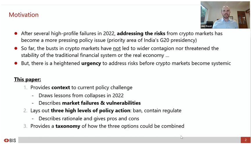Frost与其合作者在文章中描述了2022年加密货币市场的失败和相应的脆弱性。在对2022年加密货币市场的崩溃进行总结后,Frost与其合作者提供了三种应对风险的建议:禁止(ban)、遏制(contain)和监管(regulate)。Frost与其合作者分别分析了三种政策建议的优缺点,并提供了如何组合使用这三种应对策略的分类法。