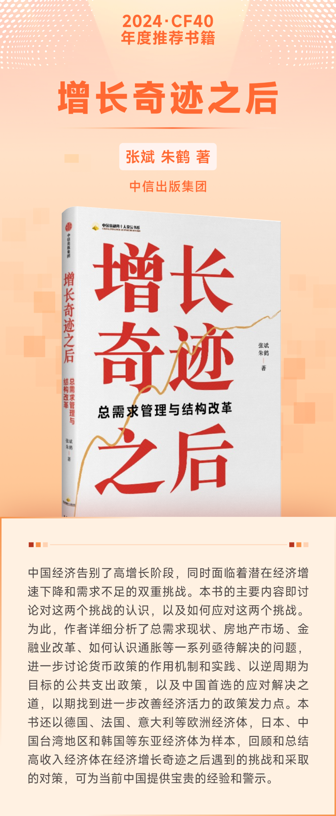经中国金融四十人青年论坛召集人会议、评奖委员会和学术委员会三轮匿名投票,最终确定2024“CF40年度金融书籍”奖项空缺;《危机应对的道与术》(徐忠、朱满洲、任晴著)、《增长奇迹之后》(张斌、朱鹤著)获评2024“CF40年度推荐书籍”。