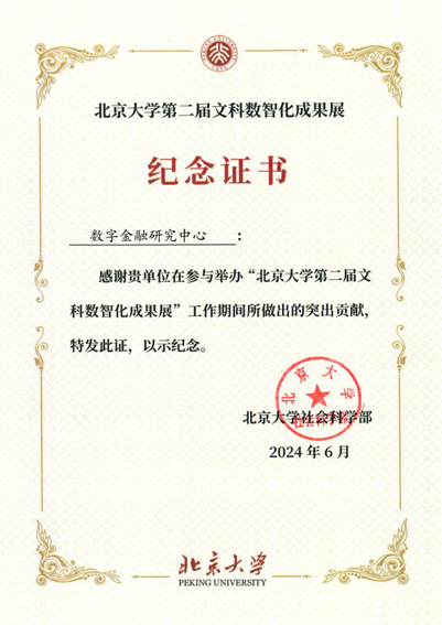 北京大学数字金融研究中心受邀参加此次展会,通过展板、图片和书籍等形式,展示了该中心成立以来的重要相关研究成果。这些成果包括数字普惠金融指数、商业银行数字化转型指数,以及中心在重大课题方面的成果和相关著作。北京大学数字金融研究中心展出的内容吸引了众多师生的关注,并获得了北京大学社会科学部颁发的纪念证书。