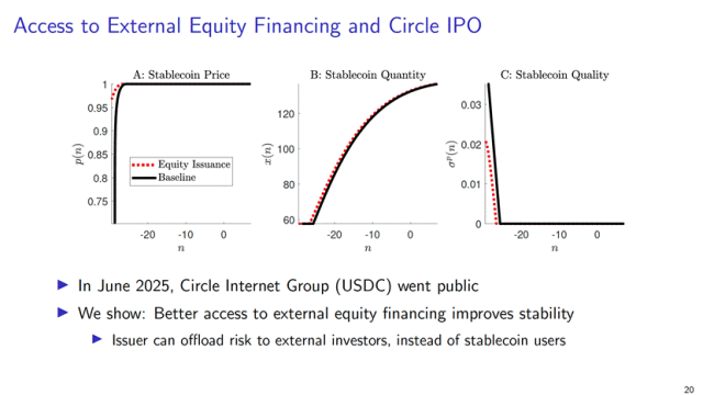 此外, Mayer 教授及合作者还分析了稳定币发行人获得股权融资(如 Circle 公司 IPO )的影响,研究发现股权融资能通过风险分担机制,显著提升系统稳定性和发行人估值。