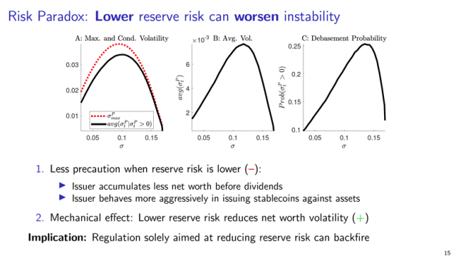 在此框架下, Mayer 教授进一步揭示了稳定币的一个 风险悖论 ( risk paradox ):在无监管环境中,提高储备资产风险反而有助于提升稳定币的稳定性。这一反直觉结果出现的原因在于,当风险较低时,发行人缺乏预防性缓冲行为,反而可能更易触发脱锚。相反,适度风险可促使发行人通过减少杠杆和储备调整来维持币值稳定。