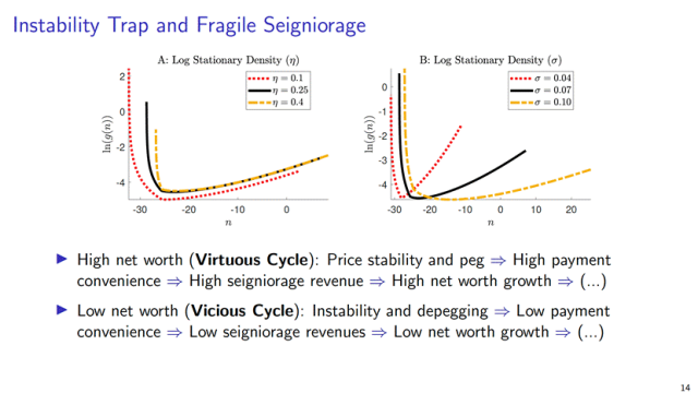 Mayer 教授及合作者提出了 “ 脆弱的铸币税 ” ( fragile seigniorage )机制:当储备资产遭受负面冲击时,稳定币发行人的净资产下降、代币脱锚概率上升,从而降低用户的货币持有效用并削弱铸币税收入。由于铸币税正是稳定币发行人恢复净资产的重要资金来源,这种负反馈导致稳定币发行人陷入 “ 不稳定陷阱 ” ( instability trap ) —— 一旦陷入净资产低位区间,将长期徘徊于此、无法自我修复。在报告中, Mayer 教授根据 Tether 的量化校准结果,展示了稳定币价格、供给及净资产的动态关系图,直观呈现 “ 稳定币脱锚 — 稳定币需求下降 — 铸币税减少 — 净值恶化 ” 的自我强化机制。