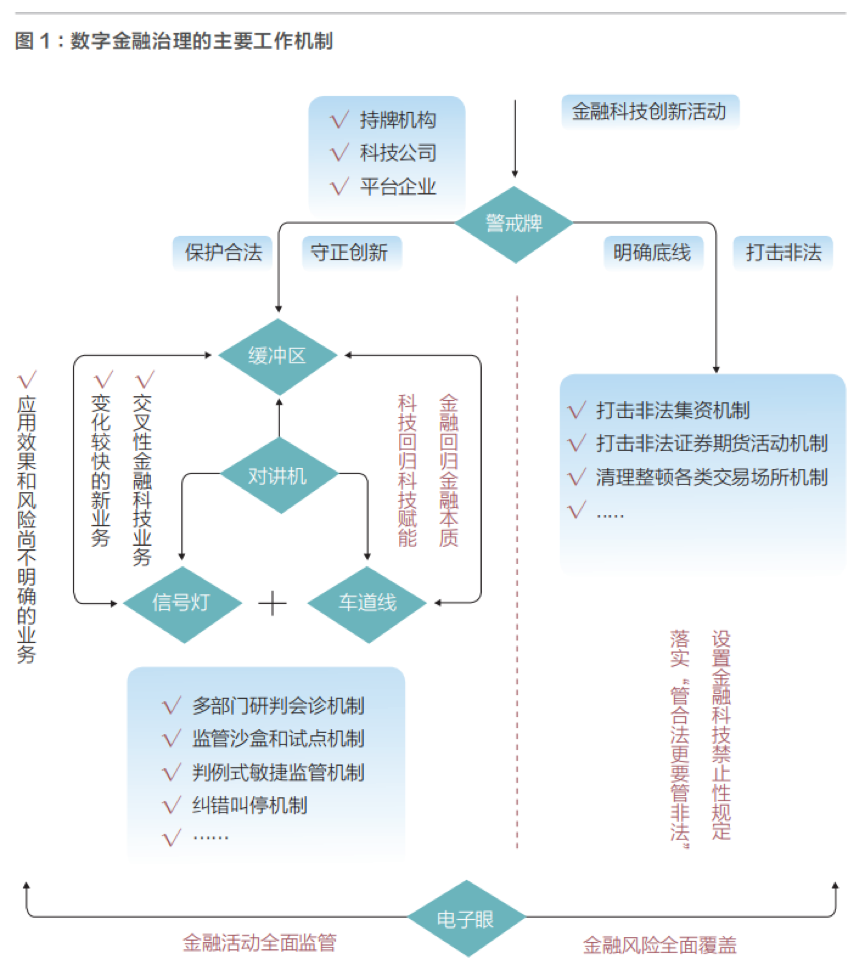 建立数字金融领域的警戒牌机制,就是要按照金融法律制度规定,科学设置数字金融领域禁止行为清单,明确刚性的法律底线,进一步健全处置非法集资、打击非法证券期货活动、清理整顿各类交易场所等打击非法金融活动工作机制,既要管持证上路,更要管无照驾驶。根据 2023 年 3 月公布的《国务院机构改革方案》,在原银保监会基础上组建国家金融监督管理总局,统一负责除证券业之外的金融业监管,强化机构监管、行为监管、功能监管、穿透式监管、持续监管,统筹负责金融消费者权益保护,加强风险管理和防范处置,依法查处违法违规行为。国家金融监督管理总局的组建有助于进一步强化打击非法金融活动的工作机制,更好地落实“管合法更要管非法”的原则。